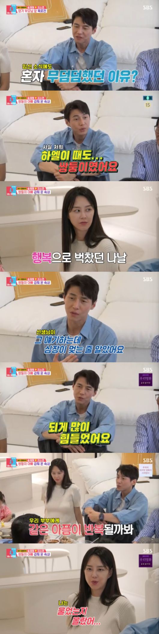 송재희는 "쌍둥이 임신 소식 들었을 때 축하하지 못했던 것은 첫째 때도 쌍둥이를 임신 했었다. 너무 좋았었다. 앞으로 아이들과 어떻게 놀지 상상도 엄청 했다. 그러다 갑자기 한 아이가 없어졌다고 하더라. 심장이 멎는 줄 알았다. 그런데 내색은 못했다. 몰래 엄청 울었고, 많이 힘들었다. 그런 일이 있고나니까 같은 아픔이 반복이 될까봐 그랬었다"고 털어놨다.
