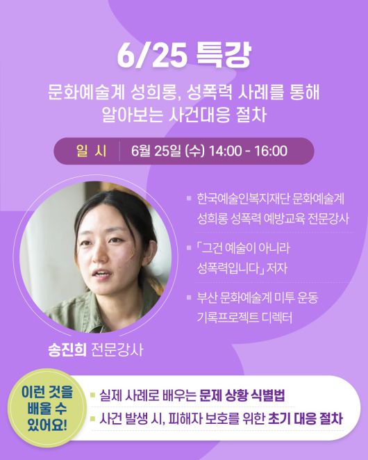 이번 특강은 예술 현장에서 발생할 수 있는 성희롱·성폭력 사건에 대한 예방법과 대응 방안을 비롯해 성평등한 창작 환경을 조성할 수 있는 주제로 짜였다.