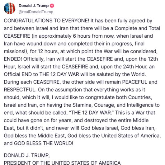 트럼프 대통령은 23일(현지 시간) 트루스소셜을 통해 “이스라엘과 이란이 12시간 동안 휴전이 있을 것이라는 데 완전히 합의했다"고 말했다. 휴전의 시작 시점은 트럼프 대통령이 메시지를 올린 시간부터 6시간 후, 이스라엘과 이란이 현재 진행 중인 최종 임무를 완수할 때라고 설명했다.