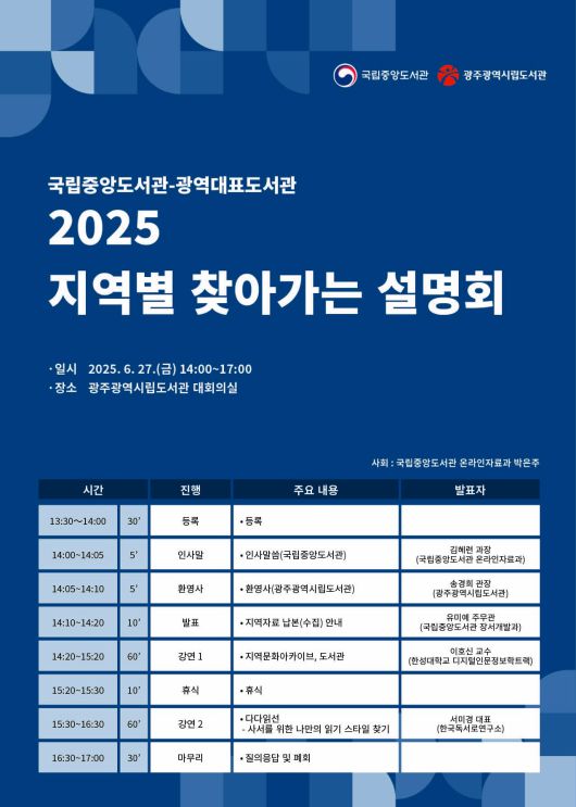 (서울=뉴스1) 김정한 기자 = 국립중앙도서관은 27일 오후 2시 광주광역시립도서관 대회의실에서 광주·전남·전북 지역 공공도서관과 유관기관을 대상으로 지역자료 수집 활성화를 위한 '2025 지역별 찾아가는 설명회'를 개최한다.