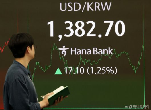 [서울=뉴시스] 홍효식 기자 = 23일 오후 서울 중구 하나은행 딜링룸 전광판에 원·달러 환율이 1382.70으로 표시되고 있다. 오후 3시 30분 기준 서울 외환시장에서 원·달러 환율은 전 거래일(1365.6원)보다 18.7원 오른 1384.3원에 주간 거래를 마감했다. 2025.06.23. yesphoto@newsis.com /사진=홍효식 |