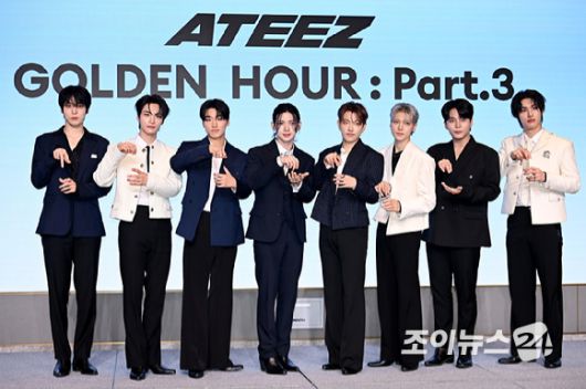 그룹 에이티즈가 12일 오후 서울 마포구 호텔 나루 서울 엠갤러리에서 열린 미니 12집 '골든 아워 : 파트 3'(GOLDEN HOUR : Part.3) 앨범 발매 기념 기자간담회에서 포즈를 취하고 있다. [사진=곽영래 기자] |