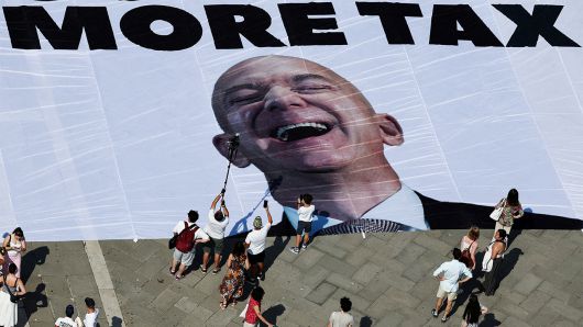 현수막에는 베이조스의 웃는 얼굴과 함께 "결혼식을 위해 베네치아를 빌릴 수 있다면 세금을 더 많이 내야 한다"고 적혀 있었으며, 경찰은 곧바로 출동해 현수막을 거둬갔습니다.
