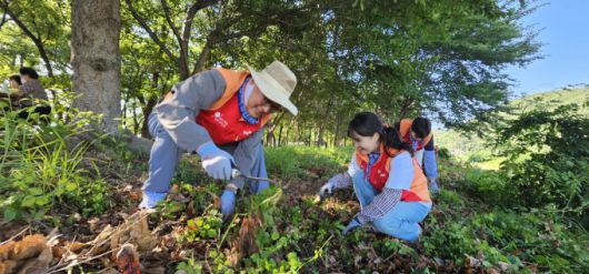 SK피아이씨글로벌 최두환 대표(왼쪽)가 구성원들과 함께 외래 식물 제거 활동을 하고 있다. [사진=SKC] |