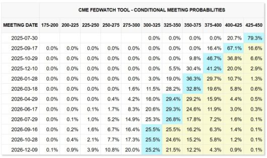 한국시간 기준 6월 24일 오전 연방기금(FF) 금리선물시장 참가자들의 연준 기준금리 전망.[표=CME 페드워치] 2025.06.24 kwonjiun@newspim.com |