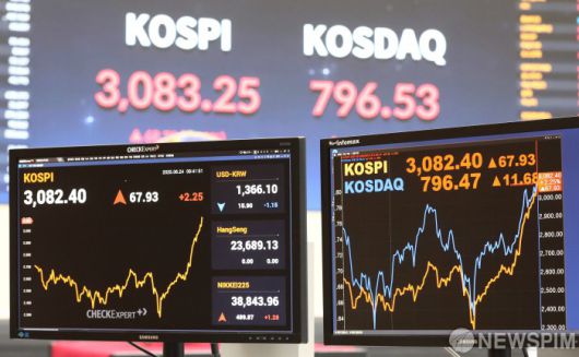 [서울=뉴스핌] 이형석 기자 = 24일 오전 코스피가 전일 종가보다 46.67 포인트(1.55%)오른 3061.14에 거래를 시작했다. 또한 코스닥은 전일 종가보다 11.27 포인트(1.44%) 오른 796.06에 개장했다. 이날 서울 여의도 한국거래소에 코스피 정보가 표시되고 있다. 2025.06.24 leehs@newspim.com