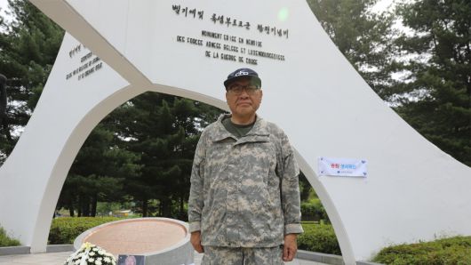 ▲ 24일 오전 경기 동두천시 벨기에·룩셈부르크 참전 기념탑에서 한국전쟁 75주년을 맞아 참배하고 있는 최성룡 납북자가족모임 대표.