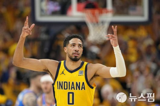 [오클라호마시티 로이터=뉴스핌] 장환수 스포츠전문기자= 인디애나 타이리스 할리버튼이 23일 오클라호마시티와 파이널 최종 7차전 원정경기에서 1쿼터 3점슛을 터뜨린 뒤 골 세리머니를 하고 있다. 2025.06.24 zangpabo@newspim.com |