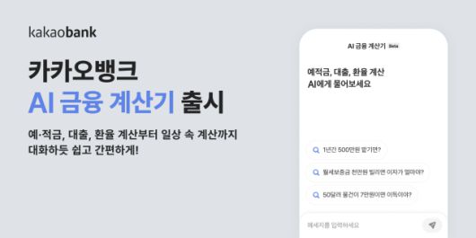 [디지털데일리 박기록기자] 카카오뱅크가 'AI 네이티브 뱅크'(NATIVE BANK) 혁신의 일환으로 지난달 선보인 ‘AI 검색’에 이어, 이번에는 생성형AI 기반의 ‘AI 금융 계산기’ 서비스를 출시했다. 고객들이 어려운 금융 계산을 쉽고 빠르게 해결할 수 있도록 돕는다는 취지다.