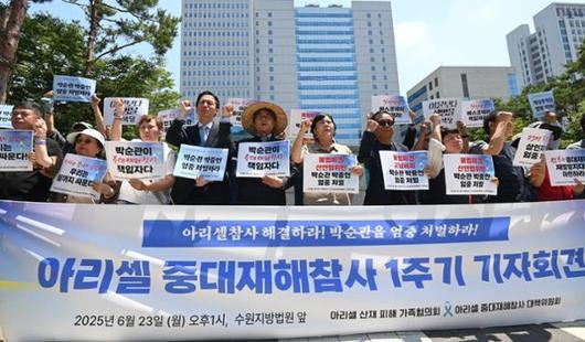 아리셀 중대재해참사 대책위원회와 아리셀 산재 피해 가족협의회가 23일 경기 수원지방법원 앞에서 책임자 엄중 처벌을 촉구하는 기자회견을 하고 있다. 뉴시스 |