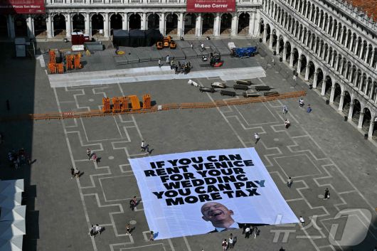 23일(현지시간) 국제 환경단체 그린피스 활동가들이 이탈리아 베네치아의 산 마르코 광장에서 제프 베이조스의 사진과 함께 "당신이 결혼식 장소로 베네치아를 빌릴 수 있다면 더 많은 세금을 내야 한다"는 문구가 적힌 대형 현수막을 설치하고 있다. 베네치아에서는는 이달 말 아마존 창업자 겸 CEO 제프 베조스와 언론인 로렌 산체스의 결혼식을 열릴 예정이며, 200명 이상의 하객이 참석할 것으로 예상된다. 25.06.23 ⓒ AFP=뉴스1 ⓒ News1 김예슬 기자 |