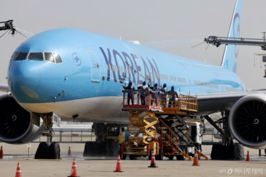 [서울=뉴시스] 김명년 기자 = 24일 오전 인천국제공항에 위치한 대한항공 정비 격납고에서 관계자들이 봄맞이 항공기 동체 세척을 하고 있다. 2025.04.24. kmn@newsis.com /사진= |