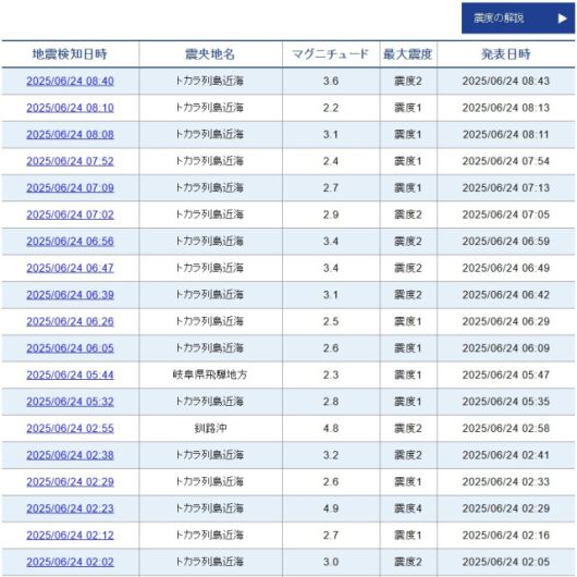 24일 일본 기상청 지진정보 일람에 따르면 일본 도카라 열도 근해에서 군발 지진(좁은 지역에서 다발적으로 발생하는 지진군)이 지난 21일부터 계속 발생, 이날 오전 9시 기준 총 314회 관측됐다.