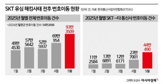 업계 일각에서는 유심 해킹사태 이후 SKT의 이동통신 가입자 점유율이 40% 밑으로 떨어졌을 것이라는 분석도 나오는 상황이다. 한국통신사업자연합회(KTOA)에 따르면 SKT의 신규가입이 중단됐던 지난달 SKT에서 다른 이동통신사로 빠져나간 번호이동 건수는 44만여건에 달한다. 이는 전달 대비 2배, 지난 3월 대비로는 4배 급증한 수치다. SKT를 떠나려는 고객들이 몰리면서 5월 전체 번호이동 건수는 약 10년 만에 90만건을 넘겼다.