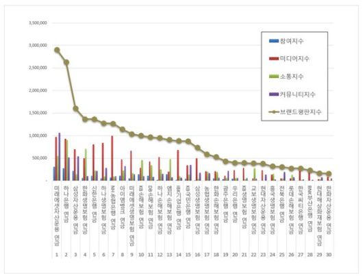 4위, 한화생명보험 연금 브랜드는 참여지수 59,110 미디어지수 501,483 소통지수 706,476 커뮤니티지수 102,001이 되면서 브랜드평판지수 1,369,070으로 분석됐다. 지난 5월 브랜드평판지수 1,954,158과 비교해보면 29.94% 하락했다.