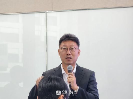 24일 서울 종로 삼화타워에서 열린 일일 브리핑에서 설명하는 김희섭 SKT PR센터장. 사진ㅣ인더뉴스 |