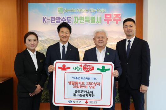 23일 골프존문화재단이 무주군청에서 '2025 골프존 이웃사랑 행복나눔' 후원식을 개최했다. 이은미 골프존카운티 지배인, 김종식 골프존카운티 사업부장, 황인홍 무주군수, 박영준 골프존문화재단 팀장. [사진=골프존그룹] |