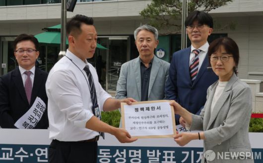 [서울=뉴스핌] 양윤모 기자 = 참여연대가 24일 오전 부자감세 원상복구와 조세정의, 재정 민주주의를 요구하는 교수·연구자 공동성명 발표 기자회견을 서울 종로구 창성동 국정기획위원회 앞에서 개최후 정책 제안서를 관계자에게 전달하고 있다.이자리에는 신승근 한국공학대 복지행정학과 교수,구인회 서울대 교수,송수영 중앙대 교수,정세은 충남대 교수 등이 참여한 가운데, 윤석열 정부에서 추진된 부자 감세를 폐기하고, 공정과세와 적극적 재정 운용으로 국가의 공공적 기능을 복원해야 한다고 강조했다. 2025.06.24 yym58@newspim.com