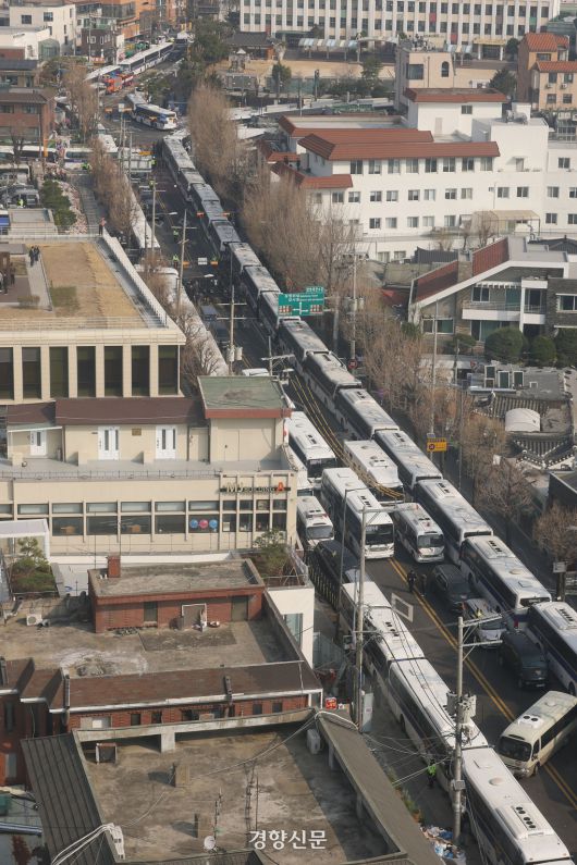 헌법재판소가 윤석열 전 대통령에 대한 파면 결정을 내린 지난 4월4일 서울 종로구 헌재 앞에 경찰버스로 차벽이 설치되어 있다. 한수빈 기자 |