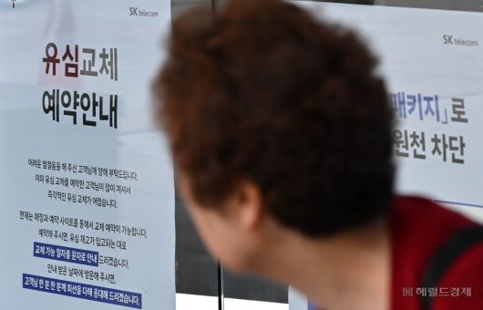 [헤럴드경제=임세준 기자] 과학기술정보통신부가 24일 SK텔레콤에 부여한 신규영업 중단 조치를 해제했다. 지난 5월 1일 SK텔레콤에 대해 신규 이동통신 가입자 모집을 중단할 것을 권고하는 내용의 행정지도를 내린 지 약 2개월 만이다. 이날 오전 서울 시내의 SK텔레콤 대리점에 유심 교체 안내문이 송출되고 있다.