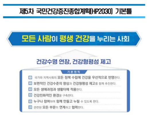 보건복지부와 한국건강증진개발원은 2012년 1월 향후 10년간 우리나라 건강정책의 방향과 과제를 담은 '제5차 국민건강증진종합계획(Health Plan 2030, 2021~2030)'을 발표했다. 이 계획에서 가장 중요한 기준은 2018년 70.4세인 '건강수명'을 2030년까지 건강수명 73.3세로 높이는 게 핵심이다. 정부는 이를 위해 SDGs 등 국제 동향과 국내 분야별·지역별 건강정책과의 연계성 확보, 향후 분야별·지역별 신규 계획 수립 시 지침으로 가능하도록 했다.
