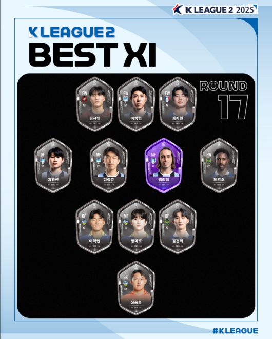 K리그2 17라운드 베스트11은 펠리페를 필두로 이정협 김영선 김성준(이상 천안) 김규민(부천) 김지현(수원) 제르소, 김건희(이상 인천) 이학민 정마호 신송훈(이상 충남아산)이 선정됐다.