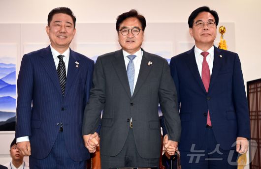 우원식 국회의장이 24일 오전 서울 여의도 국회에서 김병기 더불어민주당 당대표 직무대행 겸 원내대표와 송언석 국민의힘 원내대표와 대화하기에 앞서 기념사진을 찍고 있다. (공동취재) 2025.6.24/뉴스1 ⓒ News1 이광호 기자 |