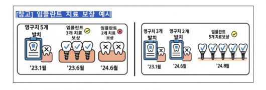 우선 금감원은 박씨의 사례처럼 임플란트 등 보철치료의 연간 보장한도는 발치한 치아의 개수 기준이며, 치료한 치아 개수가 아니라는 점을 알아야 한다고 강조했다. 박씨의 경우 2023년에 3개를 발치하고 2024년에 2개를 발치했다면 5개 치아의 임플란트 치료를 모두 보상받을 수 있었다는 의미다.