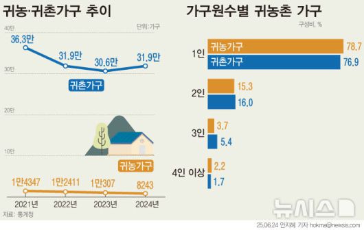 24일 통계청과 농림축산식품부, 해양수산부가 공동으로 발표한 '2024년 귀농어·귀촌통계'에 따르면 지난해 귀촌가구는 31만8658가구로 전년보다 4.0% 증가했다. 귀촌인구도 42만2789명으로 전년보다 5.7% 늘었다.