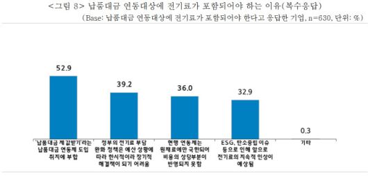 이유(복수응답)에 대해서는 △납품대금 제값받기라는 납품대금 연동제 도입 취지에 부합한다는 의견이 52.9%로 가장 많았고 △정부의 전기료 부담 완화 정책은 예산 상황에 따라 한시적이라 장기적 해결책이 되기 어려움(39.2%) △현행 연동제는 원재료에만 국한돼 비용의 상당부분이 반영되지 못함(36.0%) 순으로 조사됐다.
