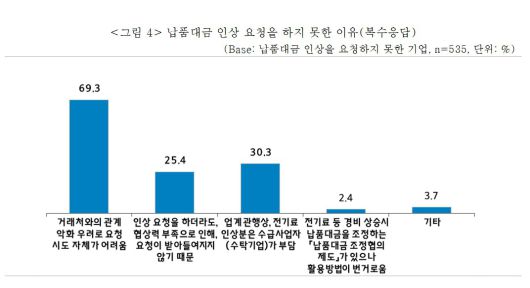 주된 이유(복수응답)는 ‘거래처와의 관계 악화 우려로 요청 시도 자체가 어려움’(69.3%)이 지목됐다. △업계 관행상 전기료 인상분은 수급사업자(수탁기업)가 부담(30.3%) △인상 요청을 하더라도 협상력 부족으로 요청이 받아들여지지 않기 때문(25.4%) 등도 꼽혔다.