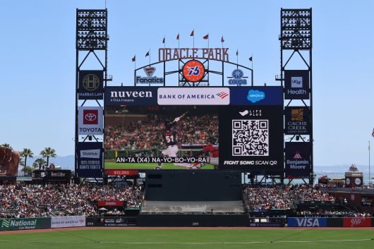 샌프란시스코 자이언츠 홈구장인 오라클파크에 리마스터링한 이정후 응원가 가사가 송출되면서 관객들이 함께 싱어롱(sing along)타임을 가졌다./한화생명 |