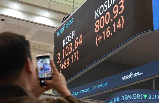 24일 한국거래소에 따르면 이날 코스피 지수는 전 거래일 대비 89.17포인트(2.96%) 오른 3103.64에 거래를 마감했다.