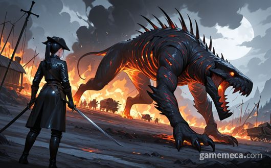 “적 스크래쳐의 습격을 받은 군 주둔지, 검은색 코트에 사냥꾼 모자를 쓴 만렙 레인저 소녀를 그려줘”