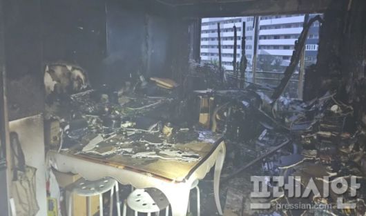 ▲24일 오전 4시 15분경 부산진구 개금동 소재의 아파트 4층에서 원인 불명의 화재가 발생했다. ⓒ부산소방재난본부 |