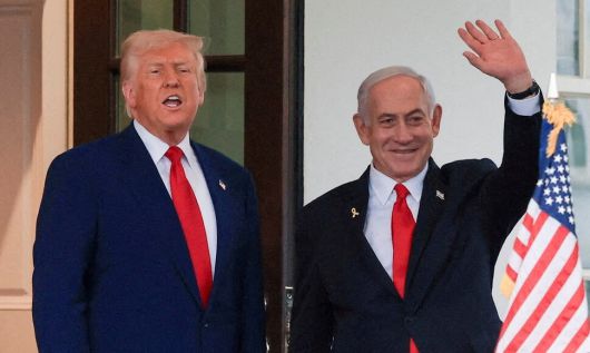지난 4월7일(현지시각) 미국 워싱턴 백악관에서 도널드 트럼프 미국 대통령이 베냐민 네타냐후 이스라엘 총리와 회담 후 기념 촬영을 하고 있다. 워싱턴/로이터 연합뉴스 |