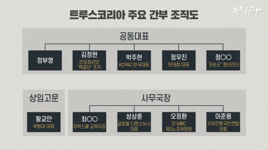 트루스코리아 간부진에는 10여 개 협력단체와 70여 명이 넘는 보수 지향 단체 인물들이 한 자리씩 이름을 올렸다. 이들 중 다수가 과거 이명박 박근혜 정권에서 국정원과 댓글공작을 벌였거나, 윤석열 정권에서 언론장악 홍위병으로 나섰거나, 부정선거 음모론을 퍼뜨리고 윤석열의 내란을 옹호한 자들이다.
