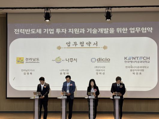 [SWTV 이일용 기자] 주식회사 디시오는 지난 19일 한국에너지공과대학교에서 전라남도, 나주시, 한국에너지공과대학교(KENTECH)와 전력반도체 기업 투자 지원 및 기술개발을 위한 4자 업무협약(MOU)을 체결했다고 24일 밝혔다.