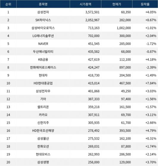 한국거래소에 따르면, 시가총액 1위 삼성전자는 현재가 60,350원으로 전 거래일 대비 4.05% 상승하며 견조한 상승세를 이어가고 있다. 상장주식수 5,919,638주에 외국인비율이 49.69%인 삼성전자는 거래량 14,901,476주를 기록 중이며, PER 11.69, ROE 9.03으로 재정 상태 역시 안정적인 모습을 보인다. SK하이닉스는 282,000원으로 8.67% 급등하며 거래량 3,022,241주를 기록, 외국인비율 55.44%로 수급에서도 긍정적인 모습을 보인다.