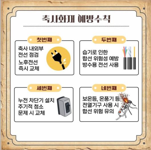 또한 화재원인은 축사 내 전열 기구의 과도한 사용, 노후화된 전선 방치, 규격을 초과한 설비 설치 등이 전기화재의 주요 원인으로 지적되고 있다.