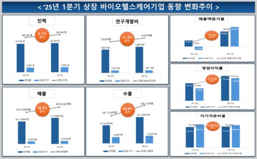기업들의 R&D 투자도 활발했다. 1분기 전체 연구개발비는 전년 동기 대비 11.4% 늘었고 특히 의약품 중소기업은 25.3% 증가했다. 의료기기 부문에서는 중견기업의 투자 축소에도 중소기업이 30% 넘게 투자를 확대하며 전체 7.9% 증가를 이끌었다.