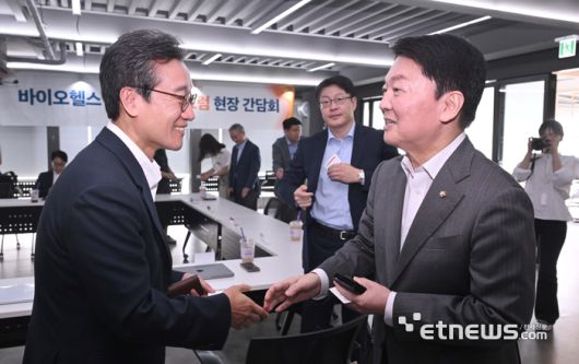 최수진 국민의힘 국회의원과 전자신문이 공동 주최한 '바이오헬스 디지털 혁신포럼 현장 간담회'가 24일 서울 송파구 비워크서울에서 열렸다. 안철수 국민의힘 의원이 참석자들과 인사하고 있다. 박지호기자 jihopress@etnews.com [Copyright © 전자신문. 무단전재-재배포금지]