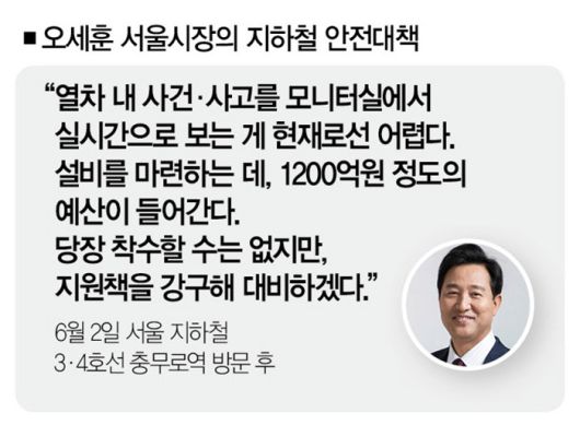 이 발언부터 다시 이야기해보자. 국비든 시비든 원천은 혈세다. 이 때문에 나랏돈을 쓸 땐 냉정하게 분석해 집행의 근거를 마련해야 한다. 그렇다면 지난 5월 말 '지하철 5호선(마포~여의나루역) 방화 사건' 후 오 시장이 꺼낸 "1200억원 정도의 예산이 필요하다"는 말의 근거는 뭘까.
