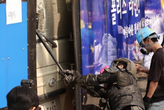 지난4일 서울 종로구 헌법재판소 인근에서 윤석열 대통령 지지 집회 참가자 중 한 명이 헌재의 윤 대통령 파면 결정에 경찰이 세운 가벽 사이로 보이는 차량을 부수고 있다./연합뉴스 |