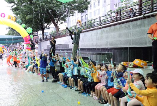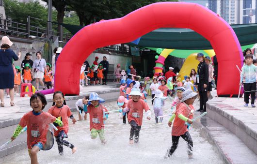 24일 서울 송파구 오금동 성내천 물놀이장을 찾은 어린이들이 물놀이를 하고 있다. 송파구는 여름철 어린이들에게 안전하고 즐거운 물놀이 공간을 제공하기 위해 성내천 물놀이장을 24일 개장했다.