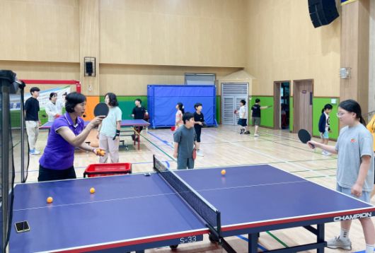 1992년 바르셀로나 올림픽 탁구 동메달리스트인 홍차옥 선수가 지난 20일 경기 파주시 탄현면 삼성 초등학교에서 학생을 대상으로 탁구 수업을 진행하고 있다. 국민체육진흥공단 제공 |