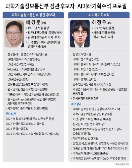 이재명 대통령은 전날인 23일, 과학기술정보통신부 장관 후보자로 배경훈 LG AI연구원장을 지명했다. 앞서 대통령실 AI미래기획수석에는 네이버클라우드 출신 하정우가 임명됐다. 두 사람은 각각 LG와 네이버에서 초거대 인공지능 모델 '엑사원(EXAONE)'과 '하이퍼클로바X'를 주도한 핵심 인물로, 기술과 정책을 모두 경험한 실무형 리더로 평가된다.