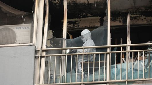 화재 현장은 불이 완전히 꺼졌는데도 여전히 매캐한 냄새가 진동했으며, 아파트 외벽은 검게 그을려 있었습니다.