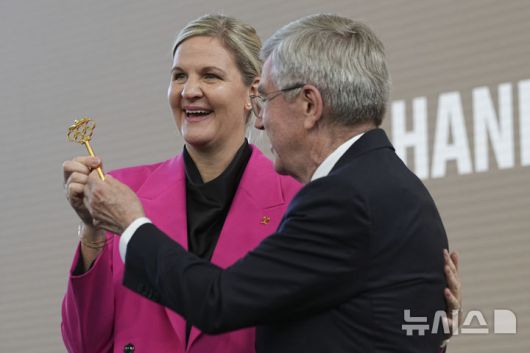[로잔=AP/뉴시스]국제올림픽위원회(IOC) 신임 위원장으로 취임한 커스티 커번트리가 23일(현지 시간) 스위스 로잔 올림픽 하우스에서 열린 IOC 위원장 이취임식에서 전임 위원장인 토마스 바흐에게 올림픽 하우스 열쇠를 넘겨받고 있다. 2025.06.23. |