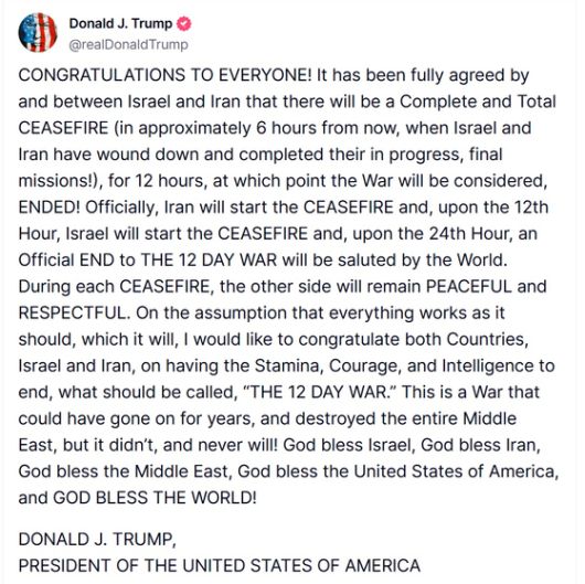 도널드 트럼프 미국 대통령이 23일(현지시간) 이스라엘과 이란이 전면적인 휴전에 합의했다며 자신의 소셜미디어 트루스소셜에 올린 글. 이란의 12시간 동안 휴전에 이어 이스라엘의 12시간 동안 휴전과 함께 24시간 뒤 세계는 ‘12일 전쟁’의 공식적인 종식을 축하할 것이라는 내용이 들어 있다. 사진 트루스소셜 캡처 |